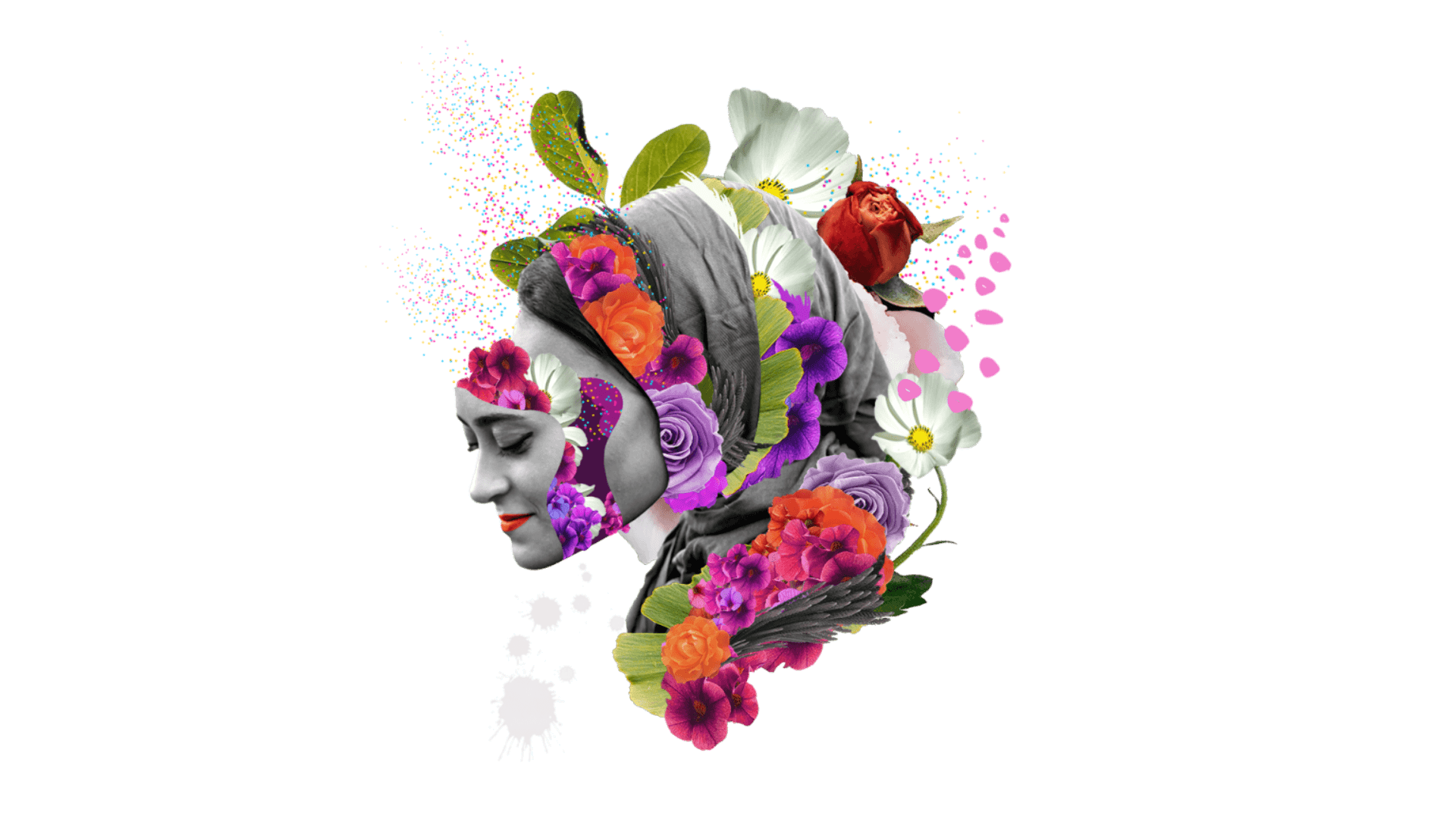 Woman's face with pink and purple flowers and green foliage growing out of her hair